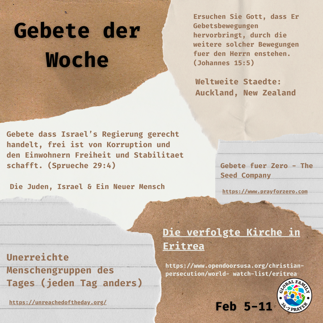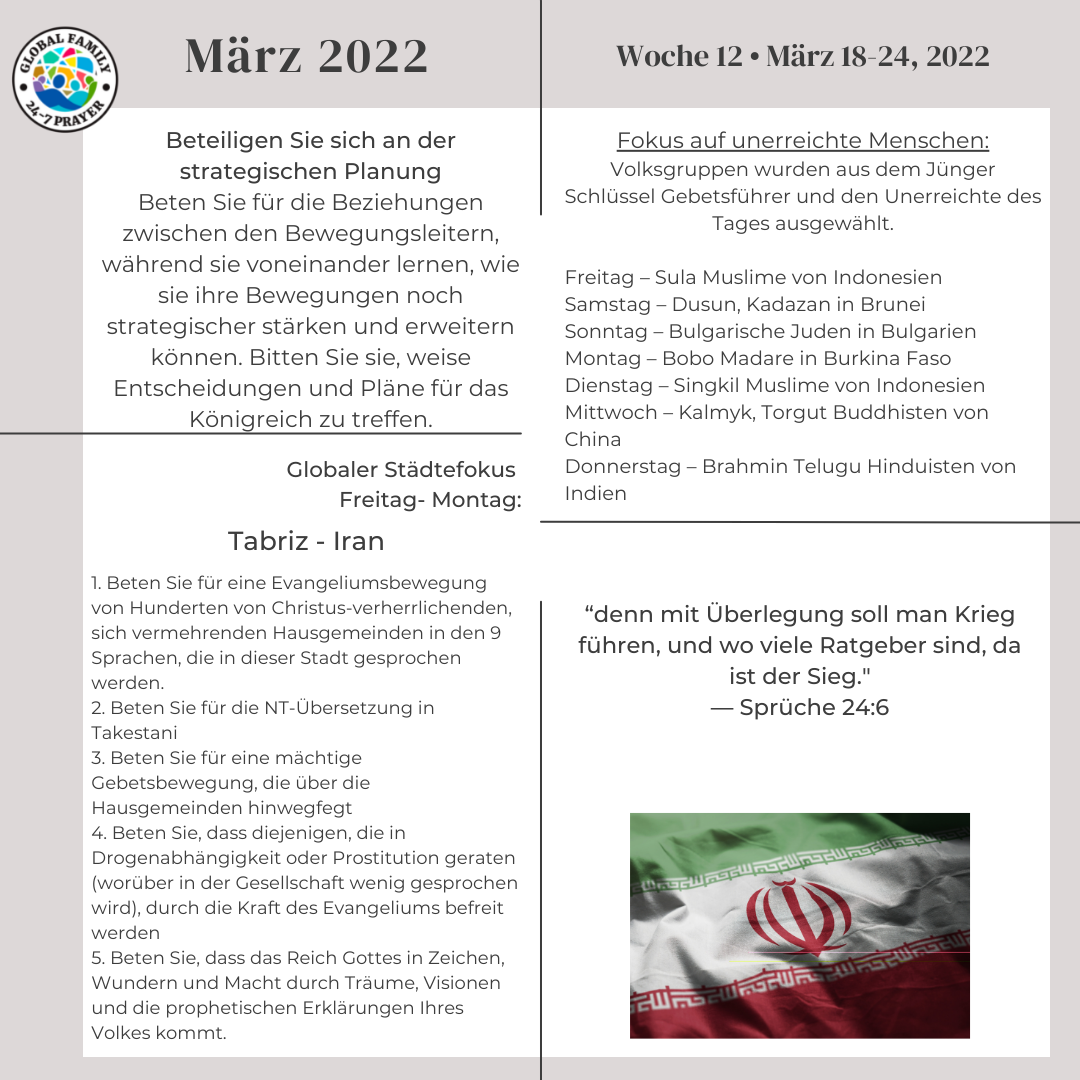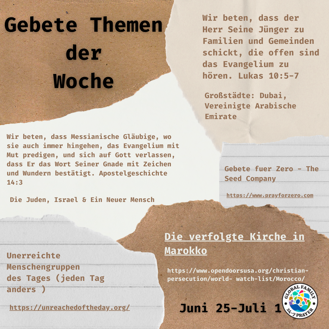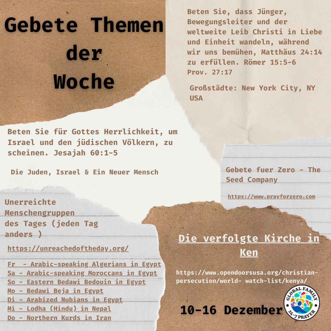 Beten Sie mit uns zusammen mit den Disciple Keys-Gebetsthemen, die eine Gruppe unerreichter Menschen pro Tag, einen 110-Städte-Fokus und ein Bewegungsprinzip plus Bibelstellen für die Woche abdecken.